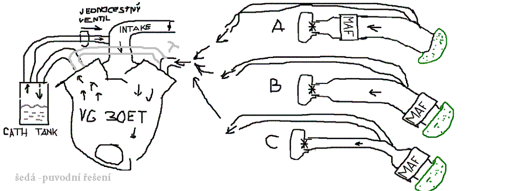 NAzdar,potřeboval bych poradit,už mám skoro hotovej motor,ale tak nějak by mě zajímalo jak podle zkušenějších nejlíp odvětrávat VG30 když je to vidlice.Bylo to udělaný tak že hadice z levého víka vedla k té do pravého a vubec tak nic do saní do motoru nic nevedlo.Máte to taky tak ?DO obrazku sem nakreslil tak nějak jak je to podle servisního manuálu originálně.Ten ventil to si nejsem jist co to tam přesně ma být,jestli sem nenapsal kravinu.Jak to prostě nejlíp udělat aby to dobře větralo